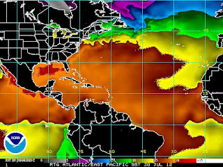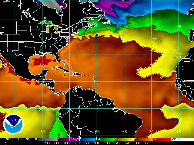 Somehow, satellites can see the temperature of the sea. This is the most current image from NOAA of the Atlantic Ocean.